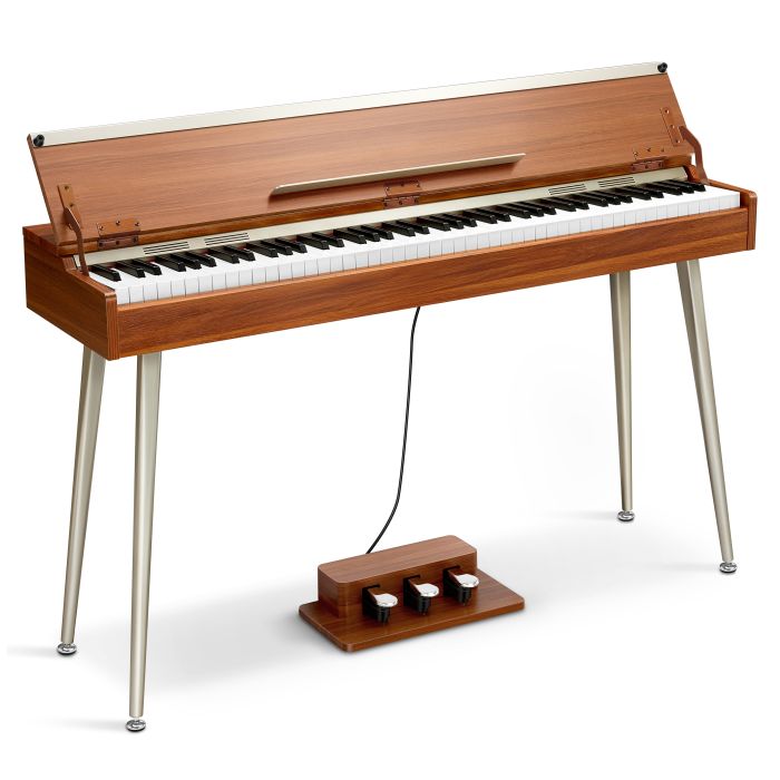 The Donner DWP-10 features a minimalist vintage cabinet in a beautiful walnut finish. Its slim and stylish metal stands with wood accents provide strong, durable support and easy setup. The space-saving design of the DWP-10 fits seamlessly into any home.